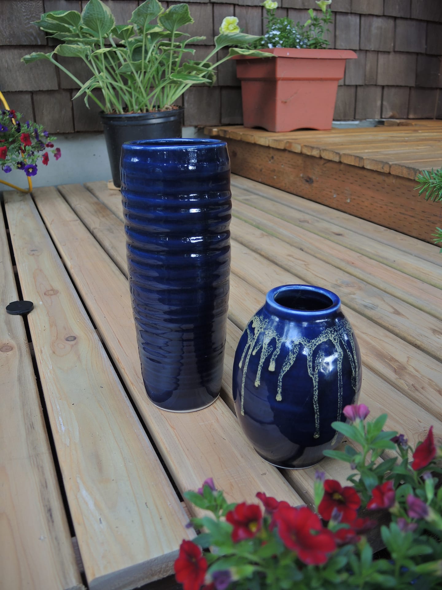 Recently my oldest friend in these parts downsized into smaller digs, and was forced to pare down the huge collection of my pottery that he had accumulated over many years. So it is that I now have on consignment three of my very early pots, probably dating back to about the mid-eighties. The blue ones are porcelain, and the covered jar is raku. They will be on display at the wine shop until they can find new homes, all proceeds to go to their current owner. For my part, it is always a curious feeling to come face to face with one of my old creations…like old photographs, they are soaked in the past, yet here they are fresh and shining in this present moment. And, like petroglyphs, they could survive me by many, many years…an interesting thought.