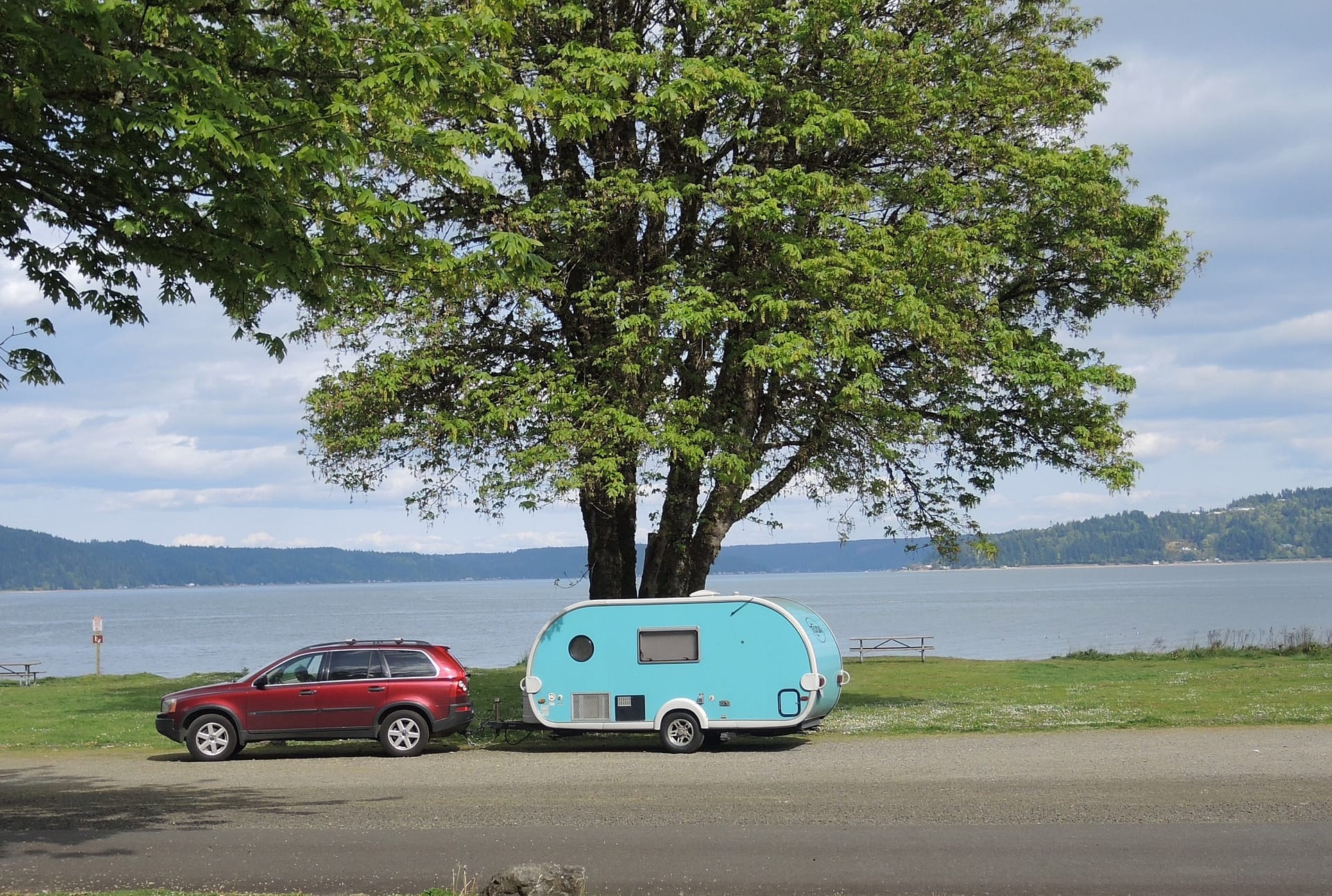 This post is being written from our site at Fort Worden in Port Townsend. It’s been cool, cloudy, blustery, and spitting rain from time to time, but cozy in the trailer. Late this afternoon the sun emerged briefly with a spectacular Rainbow framing our little trailer. That’s gotta be a good sign, right???