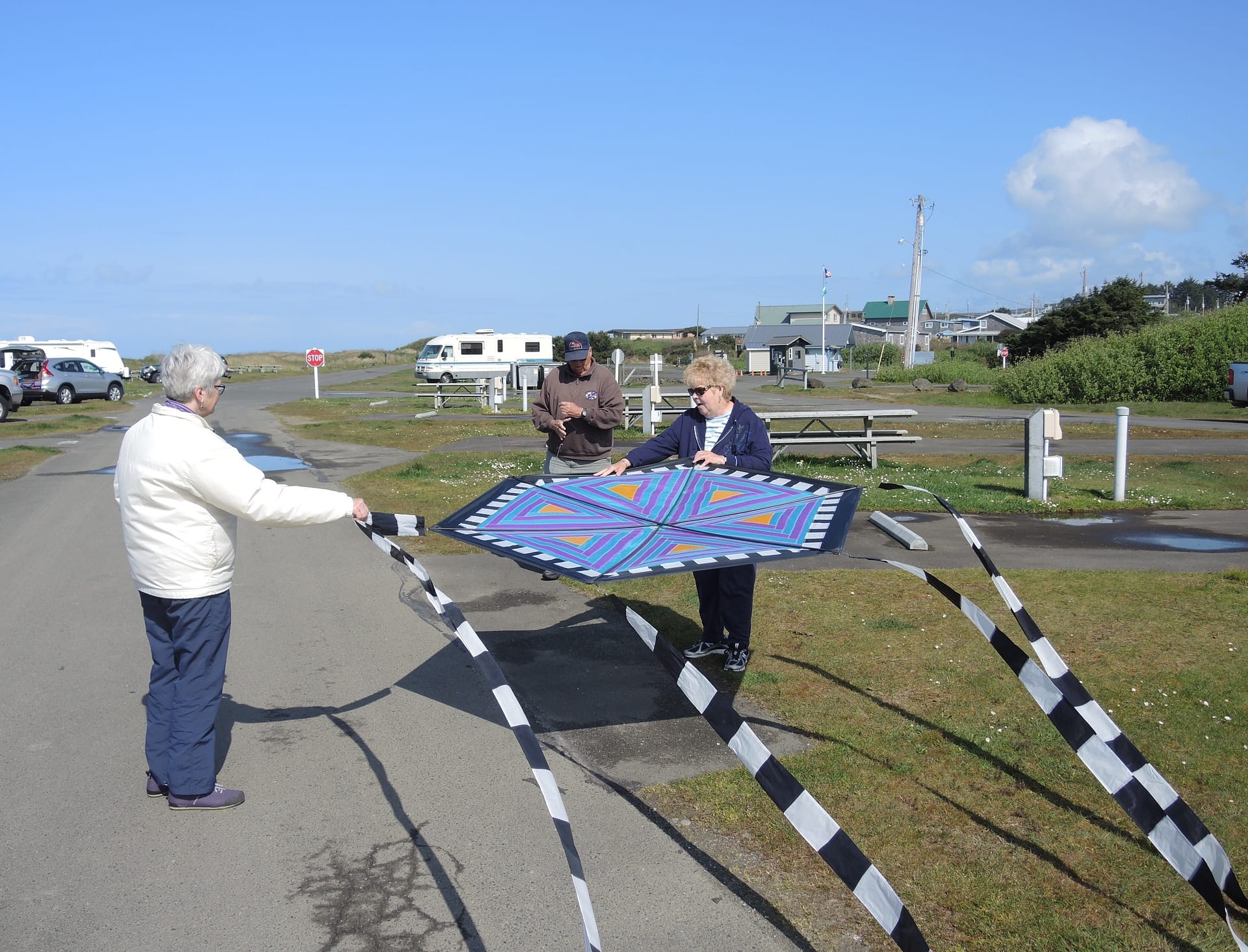We have been away for a few days with our little trailer out on the Peninsula. Monday and Tuesday we were at Pacific Beach State Park adjacent to the little settlement of the same name. We parked next to Mike and Diane, who insisted we buy a kite for the occasion because this is Kite Country. And, to be sure, there was a constant wind from the north seldom getting below a “fresh breeze,” and often considerably more energetic than that. Here’s our little kite, above.