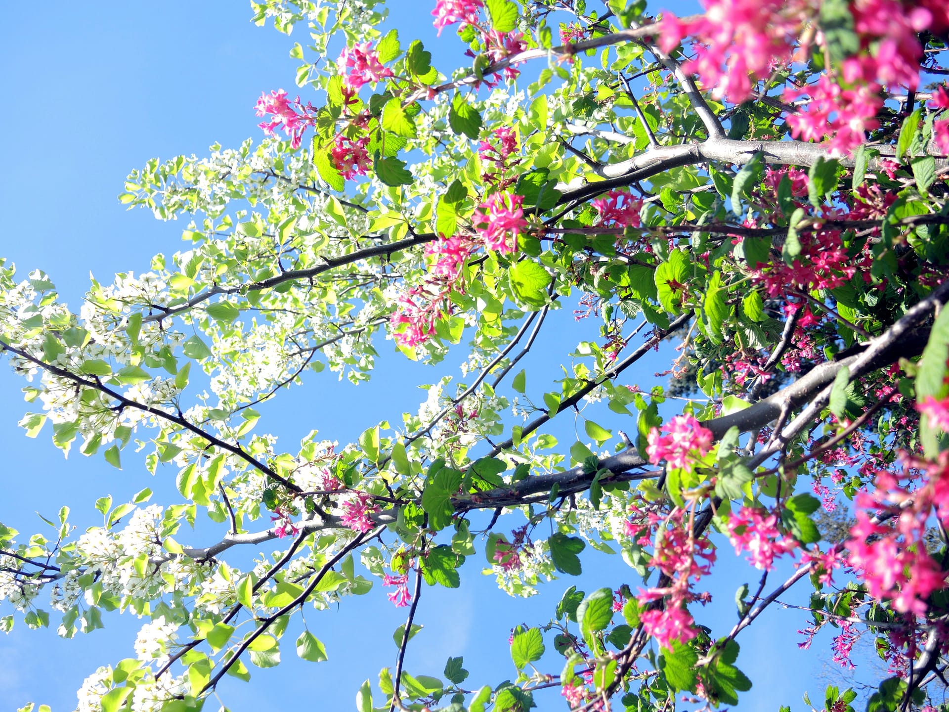 This past week we have all been basking in the Return of Sunshine. Mornings have still been Chilly, but a bit after noon the radiant heat of the Sun gets luxuriously warmer. Coupled with the emergence of poignantly sweet and fragrant Blossoms (as on these beautifully intertwined young quince and cherry trees at left), the warm radiance of the midday Spring Sun is Delicious and Nourishing beyond words.