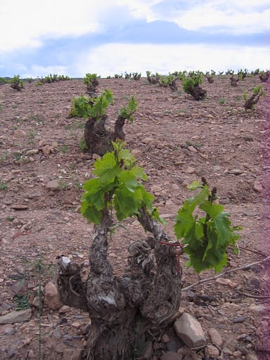 The garnacha vines that provide the fruit for Tres Picos date back to about 1920…that’s right, they are a Hundred Years Old! As shown, the vines are head-trained, with no wires, no trellises, and lots of space between them. They have deep roots after nearly 100 years of effort, and diminished yields of about two tons per acre. Such old vines dig deep into many layers of soil and provide their fruit with corresponding layers of complexity.