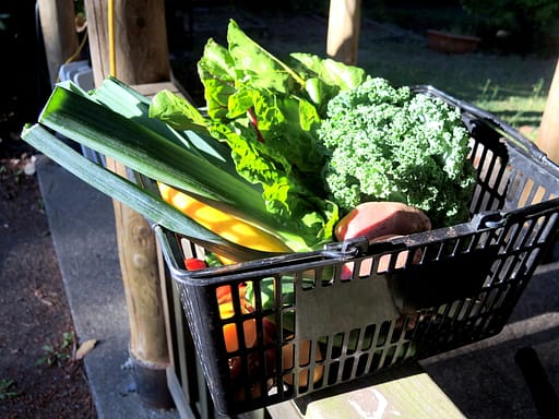 This week, as noted above, she is away, and so late this afternoon this basket was delivered by Simon, the Steward of this Island Abundance grown at his farm over on Centerview Rd. It’s over a mile by road, but half that as the crow flies. He came by about 5:30, when the summer Sun was still pretty high and bright in the west.