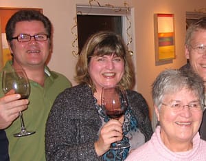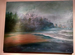 We had our first look at her latest works as we put up her show this afternoon. She uses oils on wood or canvas to develop complex textures and color ranges that evoke the many moods of the Pacific Northwest that you all will recognize but may have a hard time defining.