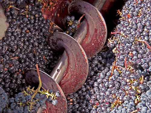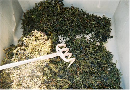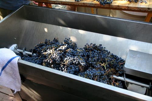 Images, above: 1) destemmer hopper; 2) close-up of destemmer worm gear that gently separates grapes from clusters; 3) resulting bin of stems that requires a second pass to get all the grapes (no, the Big Guys don’t bother with this step!). (click on the thumbnails for larger images)