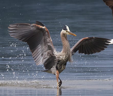 Last week we had an up close encounter with a great blue heron , and it was absolutely breathtaking! We were walking the dogs on Legoe Bay Road, along the little slough across from the old aquaculture school, when we startled into flight the Greatest Blue Heron I have ever seen! It must have been standing in the water very close to the road, hidden from view by the rose bushes, when very suddenly, with Great Whooshing-Flapping it filled the air right in front of us, huge and angular, massive wings unfolding and grabbing air, reaching for altitude. Even when it landed fifty feet away on the other bank it seemed the biggest Great Blue I had ever seen! (this is the very one, left, just sitting…ah, so very Zen…!)