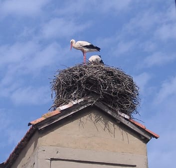 We visited the Muga winery in Haro some years ago. Unfortunately, we also had some kind of bug that forced us to cancel several other winery visits we had scheduled. So we laid low, took some short walks through Haro’s narrow streets, and…during our convalescence we were entertained by the stork pair nesting about thirty feet away on the rooftop directly across the narrow street from our little second-floor apartment.