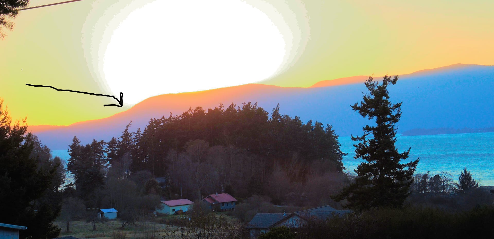 On a more familiar and more mundane level, on the left-above is a photo (tampered with) from several days ago, and another (below) from a few years ago of the actual Solstice sunset, about where the arrow is on the first photo. Considering all of the present day evidence of ancient solar observation (Stonehenge, Chaco Canyon, e.g.), this “Sun in Everyday Life” stuff has been around for a long time and is part of our inquisitive nature. Or as I have been putting it for some years now, at least several times a day, “Okay who are we, and what are we doing?” Or, as Suzuki Roshi put it, “before you chew your food there is rice, pickle, and soup. When you have chewed your food there is no rice, pickle, or soup. Otherwise the food will not serve its purpose.” Whichever way you look at it, infinity is still infinity, even if we can’t understand it!