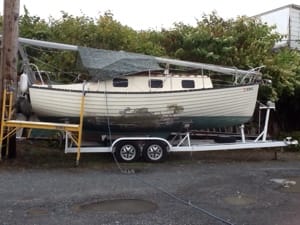A few weeks ago we talked about our excitement at having fallen for a sweet little sailboat which we had just bought. Well, merely a month later Lummi Island and the rest of the PNW were visited by a Freak windstorm of the sort that sometimes occurs in late fall or winter, but which has not occurred in recent recorded history earlier than mid-October. This past Saturday we were hit by S and SE winds of 45-50 kts with sustained gusts up to 60. Our dear little Dreamtime was caught on her mooring with inadequate lines to meet the challenge (we hadn’t gotten around to it yet…dumb mistake), and snapped free around noon. Within about 15 minutes she was swept a quarter mile north onto the rocky beach just south of the ferry dock.