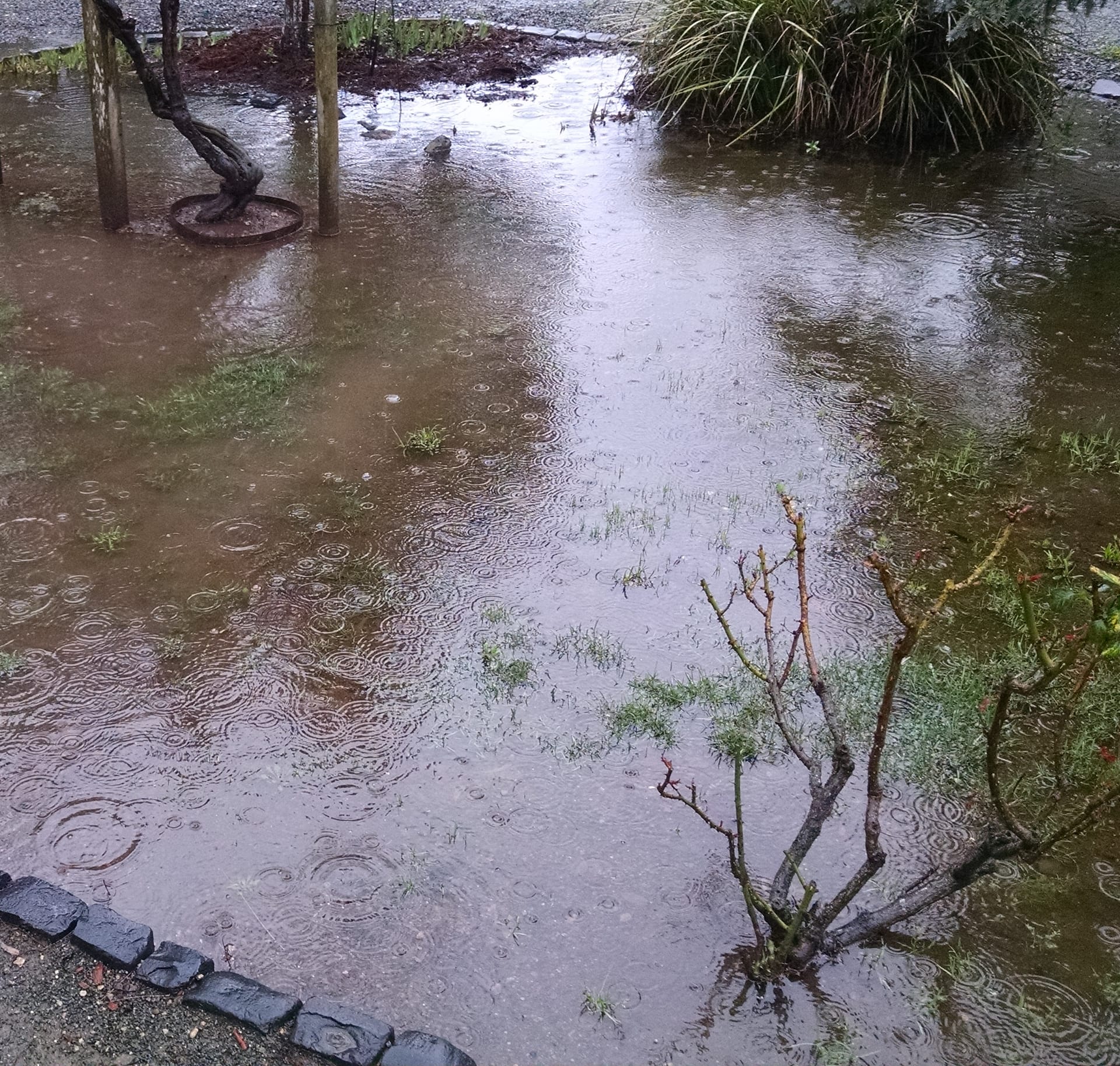 While it has been snowing all week on Lummi Island, it has been raining all week here in Sonoma. Today is promised an additional 1-2″ accumulation. The ground is totally saturated, so it sits in pools or runs to lower ground. Here is a pool on top of the lawn (yes, there is grass under there.) Supposed to get a few dry days starting tomorrow, when we will start our trek home.