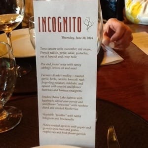 Instead of staying respectably home tonight and focusing on this blog entry, we spent the evening at “Ciao Thyme” for yet another “Incognito Dinner.” Since it is late, and since each picture is worth So Many Words, a few photos will hopefully convey the spirit of the Event. Here’s the menu, photos below.
