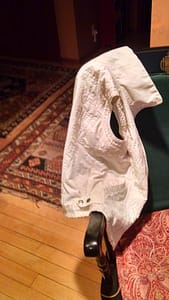 We also have a lightweight, white Columbia quilted vest, worn enough to be someone’s favorite. Zips like a man’s jacket, but has a feminine feel and a diminutive size…i.e., too small for me!