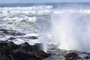 Okay, we’re BACK! We count ourselves fortunate to have hit the road heading south before the weather turned, well, ugly around here. We spent a few days with friends on the Oregon Coast at Yachats (“yah- hats”), where we enjoyed sunny days, walks along the water, and endless pounding surf…not to mention this amazing blowhole about a five minute walk from our rental (or as we learned many years ago in Mexico, “la Bufadora!” (click on photo for larger version)
