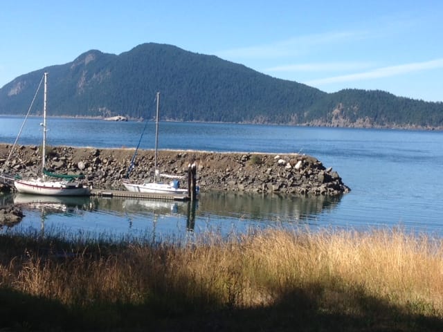 vendoviIn December 2010 the San Juan Preservation Trust purchased and protects Vendovi Island, a 217-acre, virtually untouched island with nearly three miles of shoreline, abundant wildflower fields, and lush fern forests. Vendovi sits about a mile southwest of Lummi Island, and was previously privately owned and off limits to the public. Now, however, the San Juan Preservation Trust has opened the island to limited public access by boat. There is a small dock that accommodates several small boats, and visitors are allowed between 10am and 6pm daily, May through September. This afternoon we sailed to Vendovi for a picnic and walk along the several beautiful trails that criss-cross the island. It is truly a treasure, from lovely beaches deep in shells from ancient Salish middens to quiet forest trails with views of water, islands, eagles, and mountains. This view is back toward Lummi Mountain just a few miles away. Our boat is on the right; the one on left belongs to the caretakers, who have spent a good portion of the last six years on this boat in the Sea of Cortez in Baja.