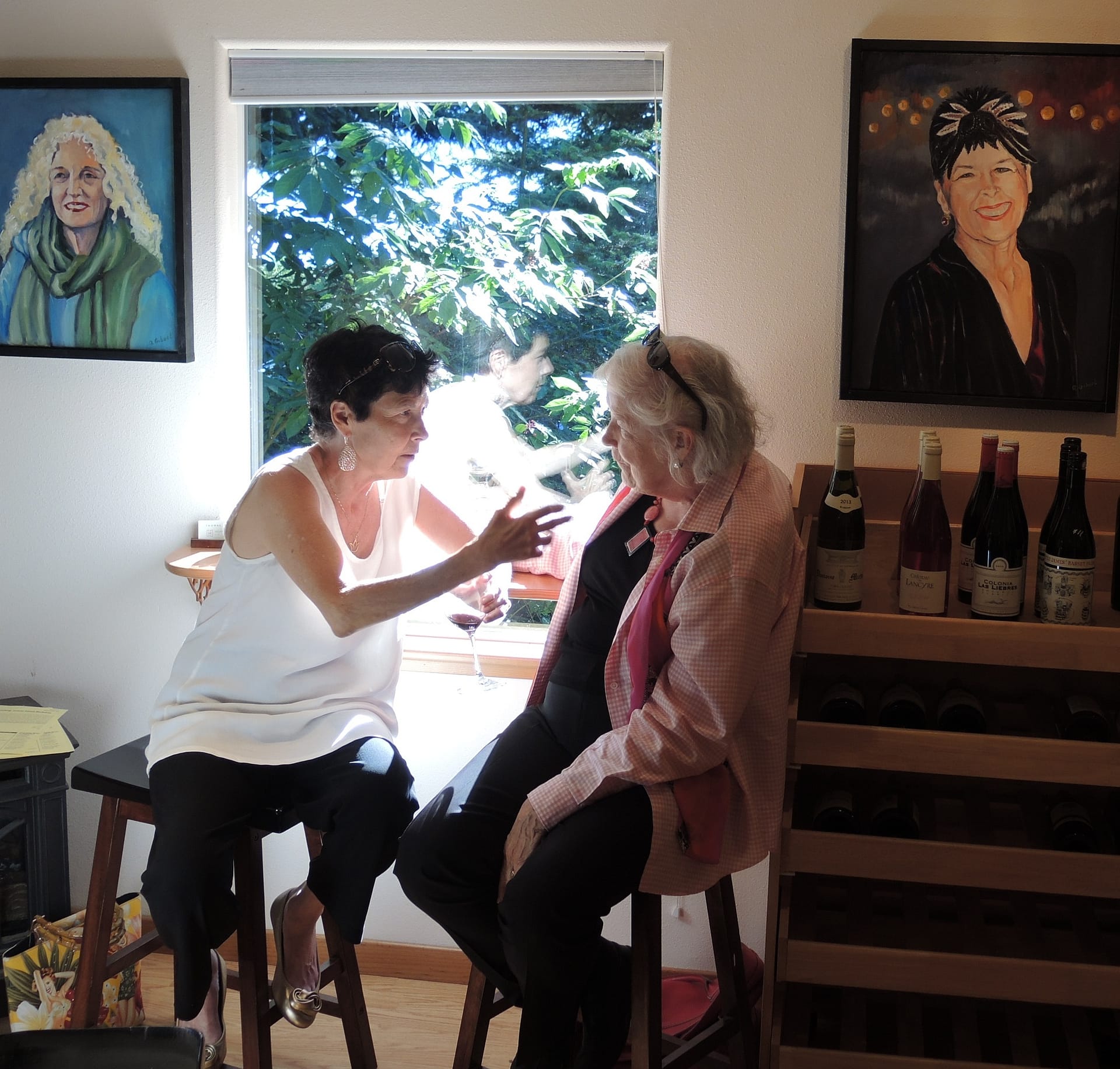 Since Anne put up her show a month ago, it has been fun whenever one of the subjects comes in. In several cases we have managed to get photos of the subjects in front of their paintings. In this case last weekend, however we were treated to a more candid photo opportunity of painting and subject (Christian, seated left, painting right).