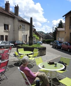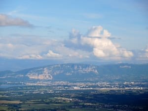However, the flight schedule this time did involve a lot of time at airports (Vancouver, Heathrow, and Geneva), and this time the relentless crush of the security queues, the stupefying heat of too many bodies too close together for too long took a definite toll. Nevertheless, we were delivered magically to Geneva, where we rented a car and drove for two hours through beautiful mountains to the little town of Arbois, in the Jura wine region about an hour and a half northeast of Lyon. Photo is looking toward Geneva from the hills north of the city and airport.