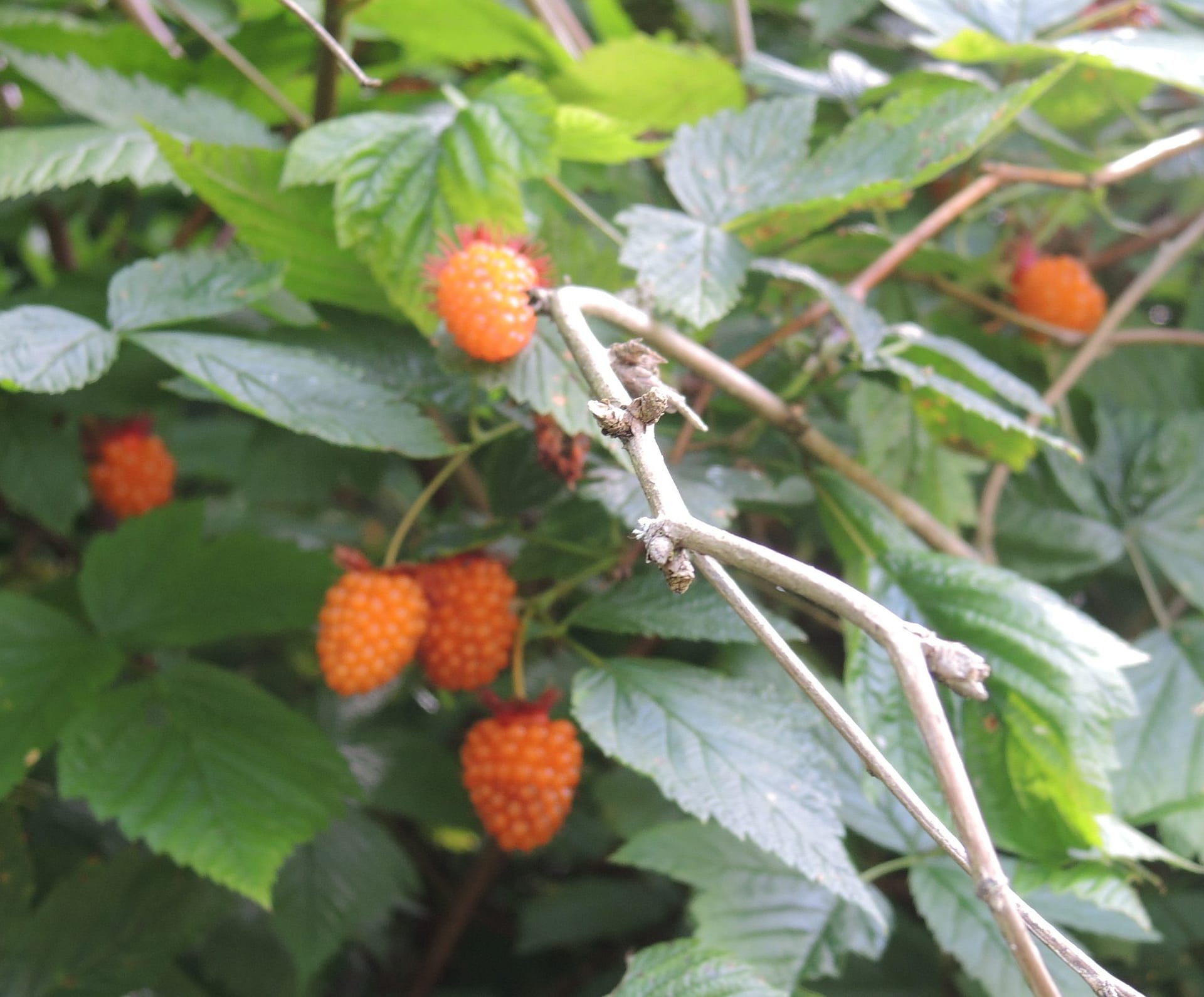 Salmonberries, stalwart staples of the Pacific Northwest, look like raspberries but occur in yellow-orange (salmon), and darker red, depending on the season. Frequencies of the two morphs vary geographically, and if this year is any indication, by climate variation. In the last week the berries here on the Island have suddenly exploded into full ripeness. And unlike previous seasons, this year we see very distinctive differences in the color of the berries from plant to plant and even on the same plant, with some berries the usual bright yellow to orange, and others ranging from red-orange to dark purple, for no known reason. We can say that both we and birds generally prefer the red berries over the salmon colored. (yes, we took this photo before we ate most of them…!).