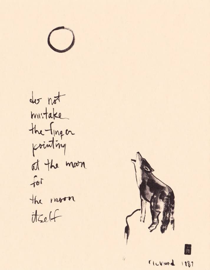 There is an old Teaching: “Do not mistake the Finger pointing at the Moon for the Moon Itself.” Its message is a Warning to remember that the Idea of Anything is is not the Actuality. Ideas are best when taken with a few grains of salt. The Moon is the Moon. A Finger is a Finger. Mind is a Metaphorical Soup, or perhaps an inspiration for a drawing.