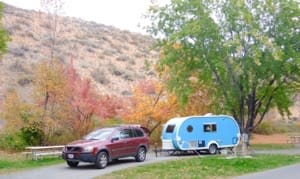 This was more true in the first couple of years when we were towing it with our old ’93 Eurovan, which was, as you can see, pretty color-coordinated. And yes, to some degree it did foster a constant danger of becoming sort of “Hos-for-Cuteness”…the adulation was So Intoxicating, More, we always wanted More…! But thankfully that suddenly changed a couple of years ago when an electrical fire in the VW wiring (yes, while we were towing the trailer) forced us to buy another car. For a lot of reasons the “new” car (2004 Volvo XC-90) is way more comfortable and more powerful, a much better towing vehicle.
