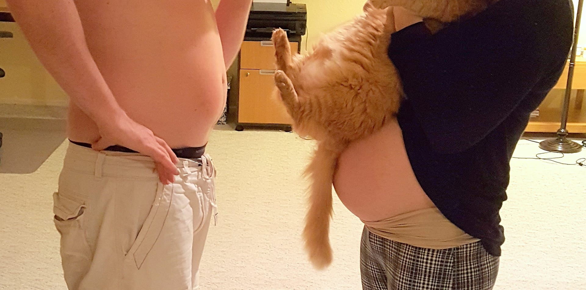 marina don belliesWe have been in Sonoma for a couple of days now, kind of hanging out, trying to stay out of the way of what is surprisingly normal everyday life as a birth approaches. As is clear in this photo from several weeks ago, where Papa Bear Don is showing Sympathetic Belly for Mama Bear Marina (holding Yellow Cat),  the Forces of Nature unfold inevitably and at their own mysterious pace.