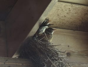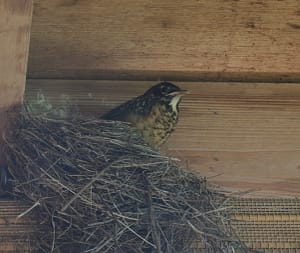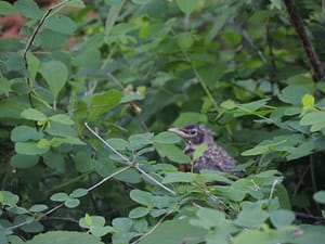 A couple of hours later there was only one young ‘un left in the nest. He would stand up from time to time and explore stretching and flapping his little wings. Hey these things must be good for Something, right? And most likely this one had seen the siblings jump out (Geronimo!) and could probably hear them nearby. So s/he had to be getting pretty motivated.