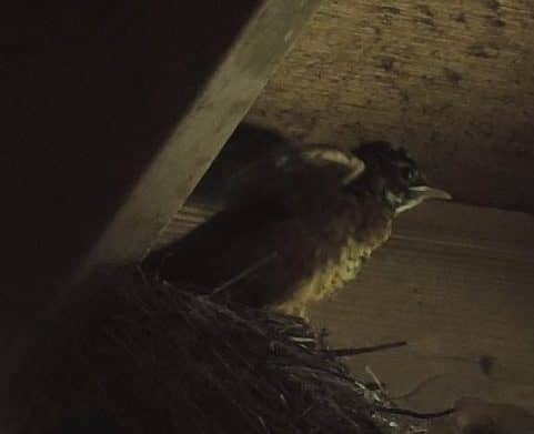 A couple of hours later there was only one young ‘un left in the nest. He would stand up from time to time and explore stretching and flapping his little wings. Hey these things must be good for Something, right? And most likely this one had seen the siblings jump out (Geronimo!) and could probably hear them nearby. So s/he had to be getting pretty motivated.