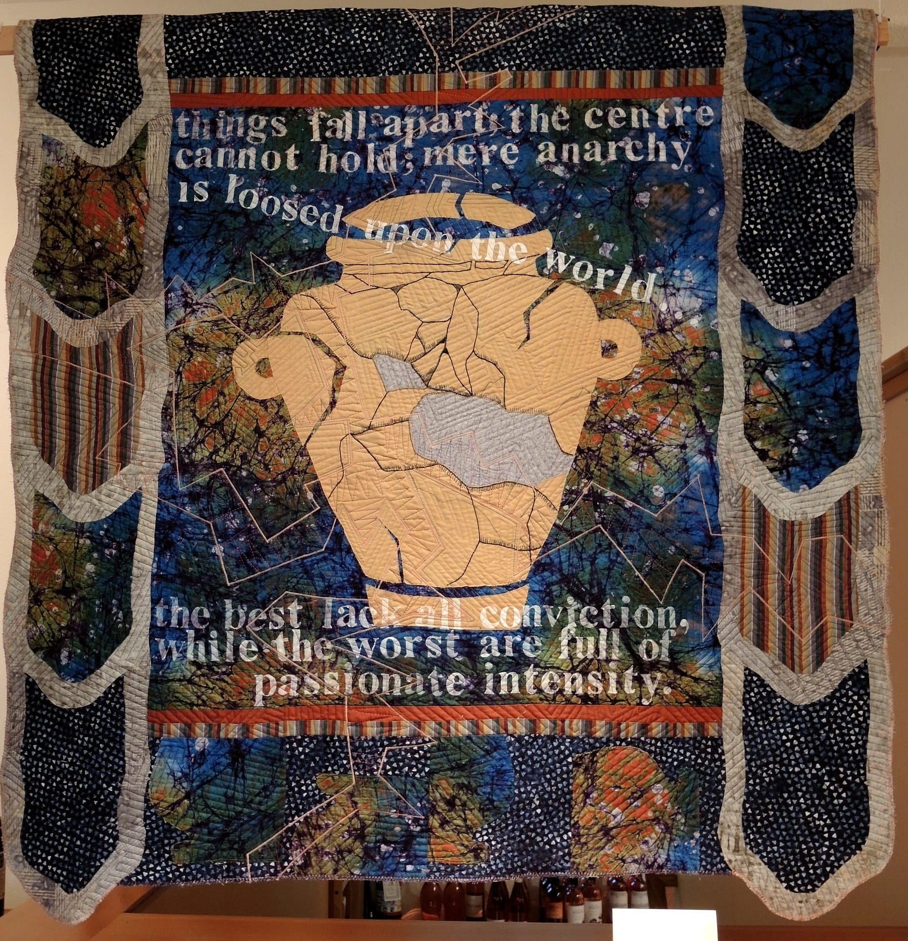 They call themselves the “IQ’s,” short for “Island Quilters.” They have been meeting somewhat regularly for many years to support and encourage each other and to exchange ideas. And of course in the process of sharing their work they also share, as friends do, a little food and wine, a bit of gossip, a lot of warmth, and a passion for their craft. Their last show here at the Wine Gallery was even before this blog started in 2009 (sorry, no links to pictures!) and since then two shows at Mindport in Bellingham. Though their styles are individually very different, they share a common craft with uncommon skill and expression. This is a great show, so be sure not to miss it! (click on photos to enlarge)