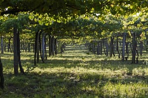 Due to the high humidity and rainfall compared to most grape-growing areas, the grapes are generally grown in a trellis system called “parra” (pergola) for best combination of sun exposure and ventilation. The pergolas are generally metal and wire supported on concrete posts, such that the grapes must be harvested from about six feet overhead using ladders or other equipment, as is the case with harvesting vinho verde in neighboring Portugal.