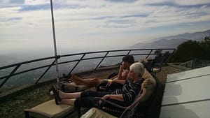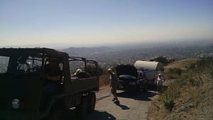 To get to his house, one drives about 3 miles up a narrow, twisting one-lane road, often with a steep dropoff on one side, with a couple of seriously steep sections. We arrived on a very hot day, near 100°, and were making good progress until we got about halfway up a 17-degree slope, the steepest on the road, and the car just stopped…it did not have the power to get the trailer up that hill, and backing down was, um, Quite Unappealing.