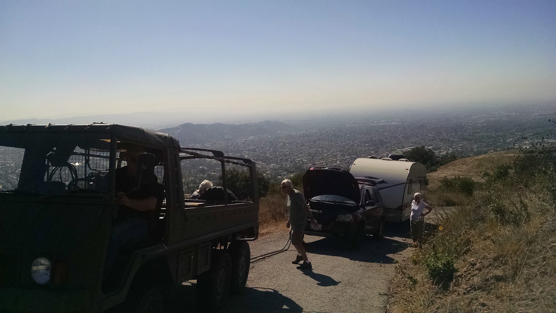 To get to his house, one drives about 3 miles up a narrow, twisting one-lane road, often with a steep dropoff on one side, with a couple of seriously steep sections. We arrived on a very hot day, near 100°, and were making good progress until we got about halfway up a 17-degree slope, the steepest on the road, and the car just stopped…it did not have the power to get the trailer up that hill, and backing down was, um, Quite Unappealing.