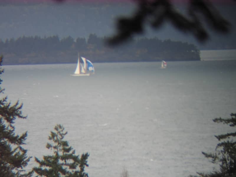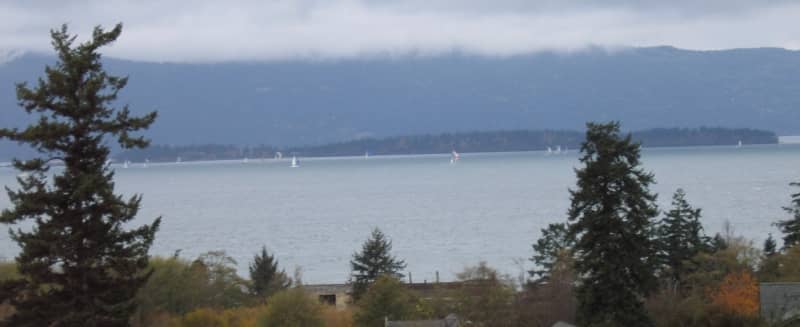 Each second Saturday in November we are taken by surprise late in the morning by the appearance of a fleet of sailboats heading north up Rosario Strait between Lummi and Orcas Islands. It’s the annual Round the County race (no, no, not Whatcom County, SAN JUAN County!), and even on a gloomy weekend like the last, it is colorful (I hope they were all bundled up out there!).