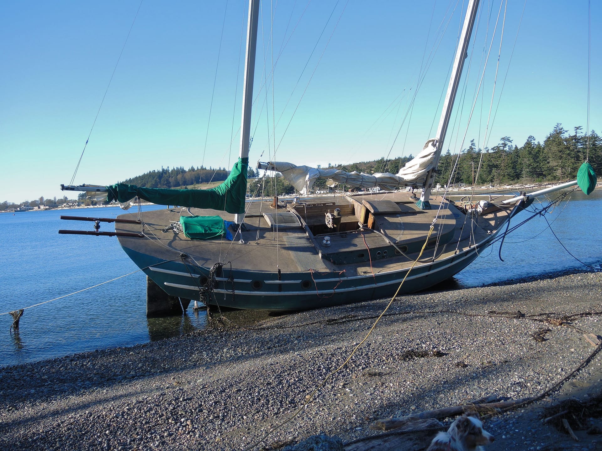 dscn1039 (Modified)The three-foot hole in her side has been repaired, and she has been drawn in higher on the shore somewhat in the shelter of Lovers’ Bluff. It may be some time until engine power is restored, and we have received no updates. We can tell you that she is sitting Very Close to the spot on the beach where the Happy Jack spent many quiet years before being carved up into car-sized chunks and hauled away Somewhere. The Green Ketch (aka “Ning Ning”) is a long way from home and needs a lot of work. So maybe she will just lie here for the winter and then we’ll see.