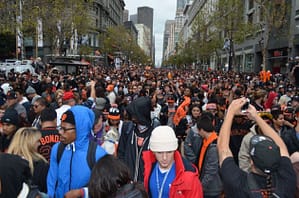 We are in the Napa Valley at the moment, but were in San Francisco for a couple of days before coming here yesterday. Many of you may know that last weekend the SF Giants won the World Series for the second time in three years, so on Wednesday there was a HUGE celebration parade, which started downtown near the Ferry Building at the end of Market Street at exactly the time we needed to be in the same place to catch BART to the Oakland airport to pick up a rental car. That meant that we converged with the million or so (yes, Really!) people coming into the city at the same point for the parade. The sidewalks were so crowded one couldn’t see the stairs down to the subway even from a few feet away. So it took about 20 minutes of wandering/pushing through the hordes of Giants ballcaps, jackets, sweatshirts, and costumes to find the BART entrance. It was all very, very festive, the beginning of an all-day party across the city…and from our perspective, a good time to leave town!