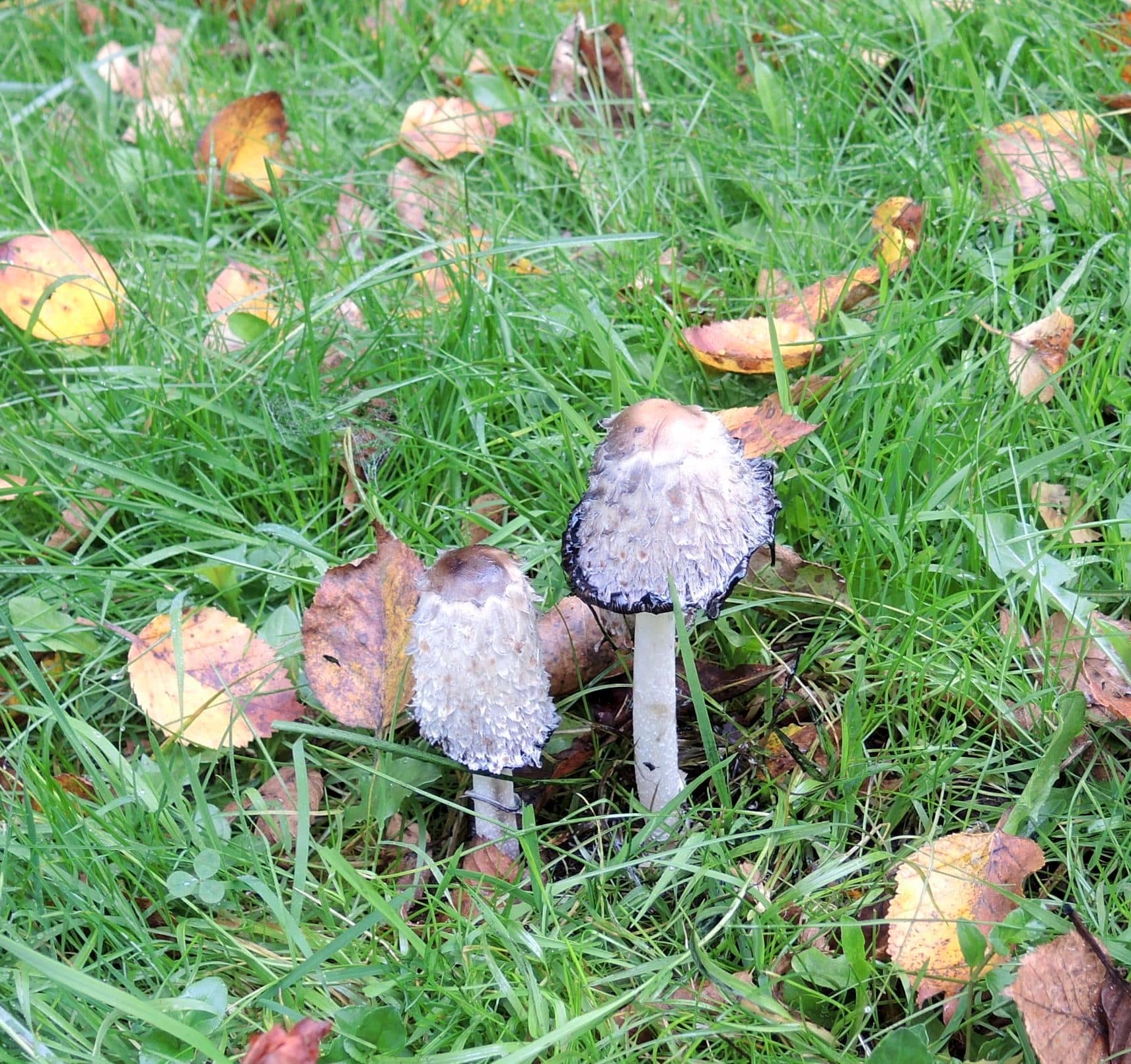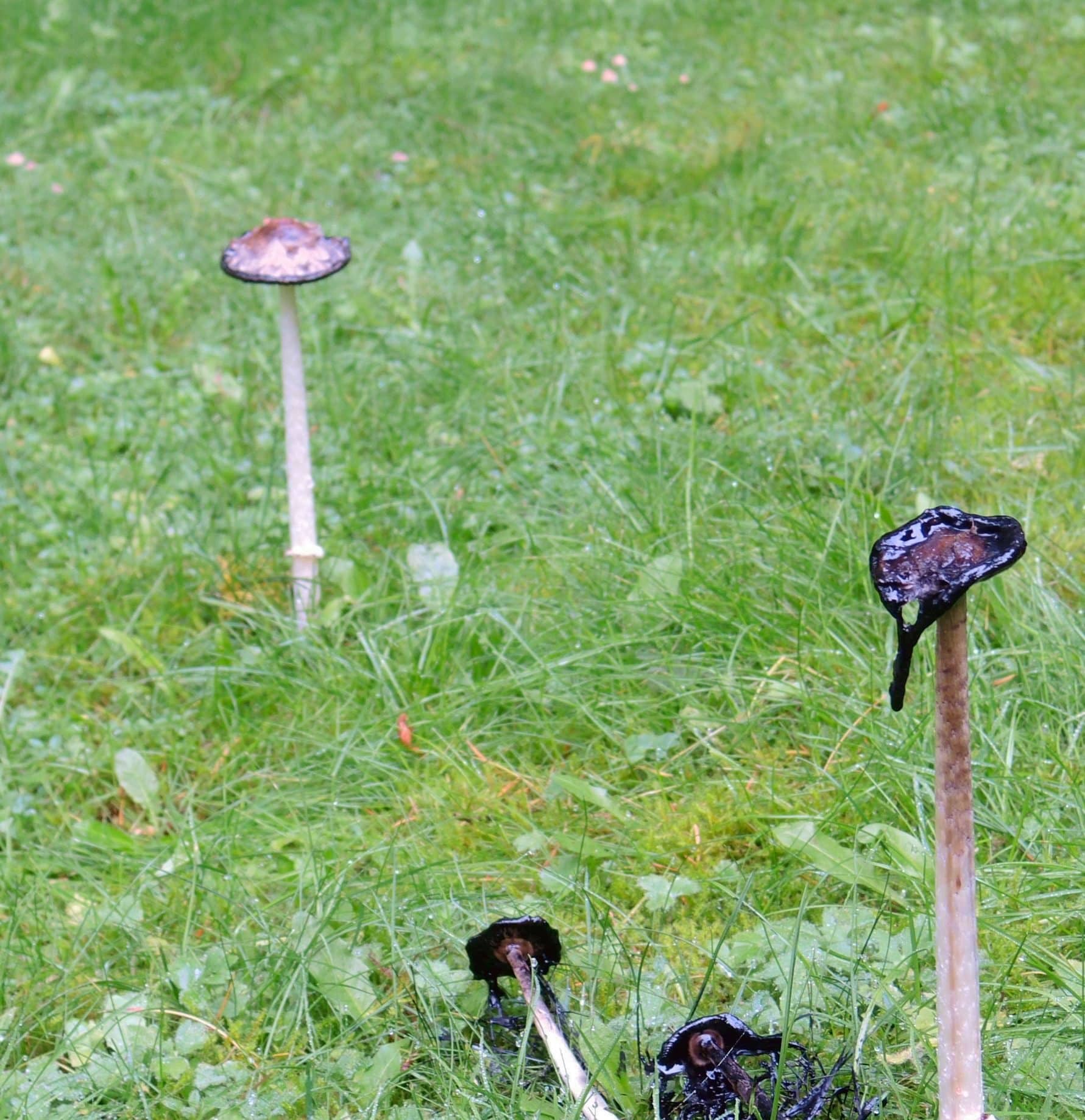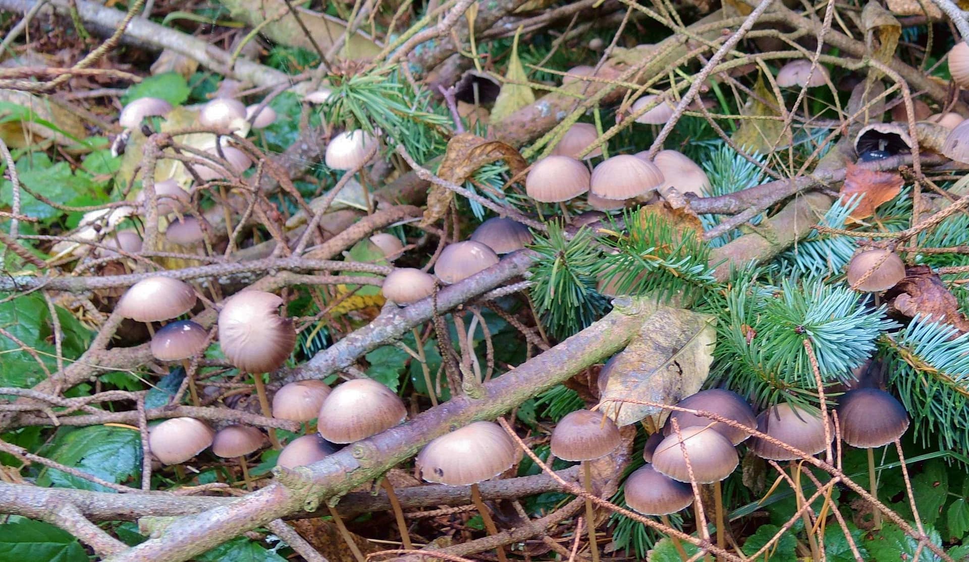 dscn0353 (Modified)It’s been the foggiest week I can remember around here, most of the day, every day for the past week. Cold, dark, and damp. A little trying for some of us, but as it turns out GREAT for mushrooms. A walk through Otto Farm yields an amazing array of exotic fungi, but even in our own neighborhood I found all of these (below) just today. Our forest-supporting, underground fungi thrive in this weather, making their presence known by sending up mushrooms –sort of “fungus flowers”– or “fruiting bodies,” of certain fungal organisms; their role is to produce spores and release them, after which they can melt back into the earth (as in last photo). Many, of course, are delicious to eat; others are deadly poisonous; and still others can turn you into Alice chasing the White Rabbit.