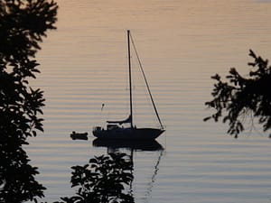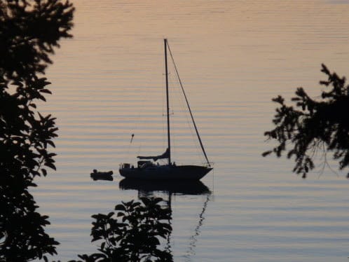 WHY am I writing the blog early , you might wonder…? It is so we can take off for a few of these beautiful late summer days on the boat. Somehow the summer has slipped through our hands like water, frictionlessly, leaving all the imagined outings and explorations on the impossibly cluttered and overloaded Shelf of All the Things You Didn’t Get Around To, and it seems important to wrest from the relentless Hands of Time at least a few days of bobbing at anchor in a quiet cove. (not our boat, but you get the idea…!)