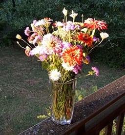 Photo at left is a bouquet from the extensive flower garden of our neighbor Colleen a couple of houses away. Occasionally in recent weeks she has had extra bouquets which we have made available on the deck at the wine shop during open hours. NOTE: bouquets will be available for sale during Friday’s tasting!