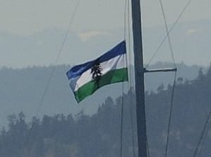 The three or four of you who occasionally read this blog may have noted the post last week about the unidentified flag seen flying from the green ketch moored in Legoe Bay over the summer. We posted an offer for a Free Tasting to the first person who could identify the flag. As it turns out, we did sort it out on Saturday in a group discussion at the wine shop (special kudos to Steve W). Then a few days later I discovered an email at our “other email address” in which Nancy G correctly identified it as the flag of Cascadia…!