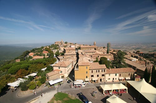 Montalcino from atop the fortress wall (wide angle Wikipedia photo):