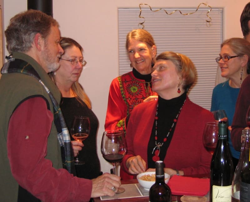 One of the big challenges each year is appointing a Designated Timer, whose personal chronometer is in such “accord with the great sidereal movement with which time is generally reckoned” that we may be reasonably sure that we are celebrating at exactly the right time. Last night it was Jerry, sporting his new watch that continually checks in with the Great Vibrating Crystal kept at Greenwich or the Naval Observatory, or wherever, which keeps the Official Time of the World. So Jerry (an Alaska man taciturn enough to pass for a Maine Man) got the nod, and we all chanted JER-RY! JER-RY! JER-RY! JER-RY!, which might possibly have been the worst moment of his life, but we hope not. And speaking of Maine, a special welcome to our seldom-seen friend from Maine, Sarah here for the holidays with Bob and Marnie.