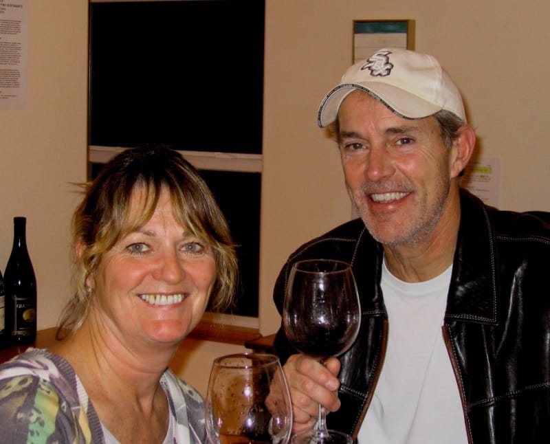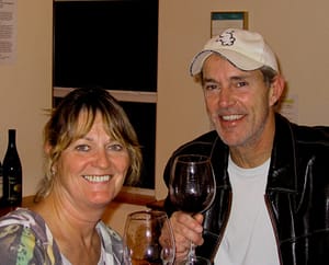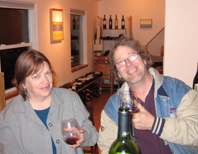 After that it was Very Quiet till about 4, when some newbies and some of the usual suspects came by.Here are Del and Terry celebrating Terry’s second week living on Lummi, and second Saturday in the wine shop…!