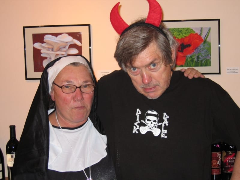 We were expecting a pretty good crowd, and imagined many would be in costume, but alas, only a few. Which is really not all that surprising for a Saturday afternoon. Then again, it isn’t that complicated to put on your old Lone Ranger mask, and a bit of stage makeup. Anyway, Russ, Kathy, and Kathy’s sister, Cindy (who is talking about moving here)—- did themselves up very nicely and set a festive mood, and late in the day Mary Jane came by decked out most convincingly as a nun, having access to the wardrobe of a new production of “Sister Act” soon to be in rehearsal somewhere nearby. She even had that stern countenance that scared the bedickens out of all the little kids in oldtime Catholic schools (it’s one of the the things Recovering Catholics are, you know, Recovering from).